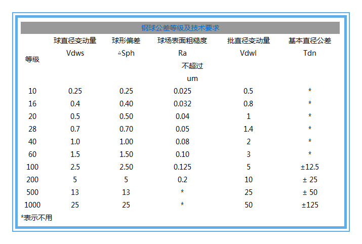主要有鋼球的直徑變動量,批直徑變動量,橢圓度,外表粗糙度,根本直徑公差等指標決議。詳細有表格如下呈現(xiàn):